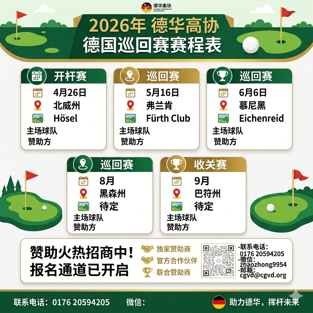 挥杆绿茵,逐梦前行。第三届德华高协与各地高尔夫协会合办的德国华人高尔夫巡回赛将横跨德国北威州、弗兰肯、慕尼黑、黑森州、巴符州五大区域,为您带来前所未有的高球盛宴!